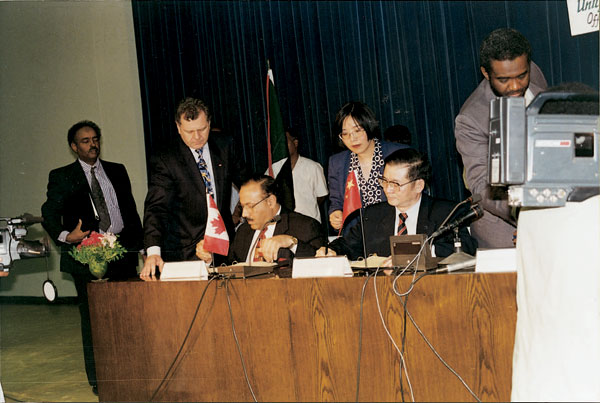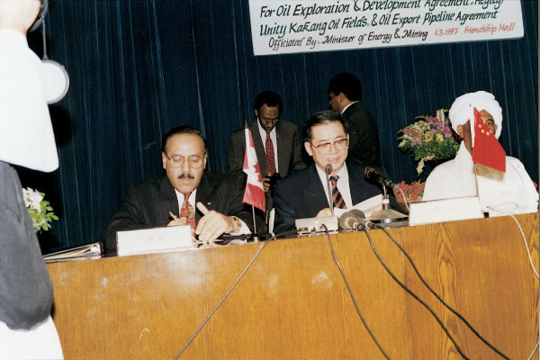 Lutfur Rahman Khan, President & CEO of State Petroleum Corporation, Canada, signing the Consortium Agreement between State Petroleum Corporation of Canada, China National Petroleum Corporation, Petronas of Malaysia and Sudapet of Sudan for the development of the project and construction of the 900 mile oil export pipeline.