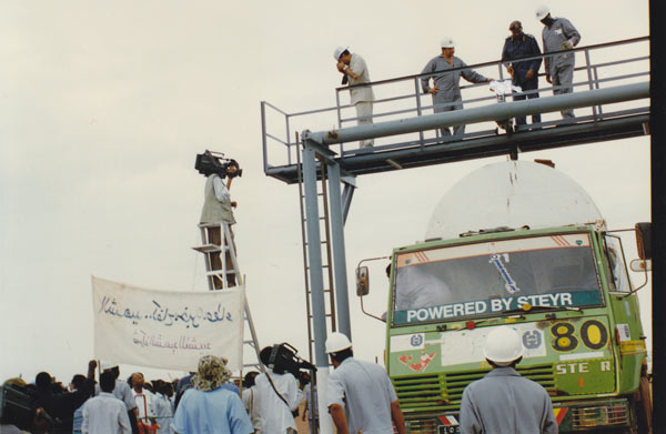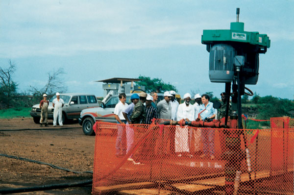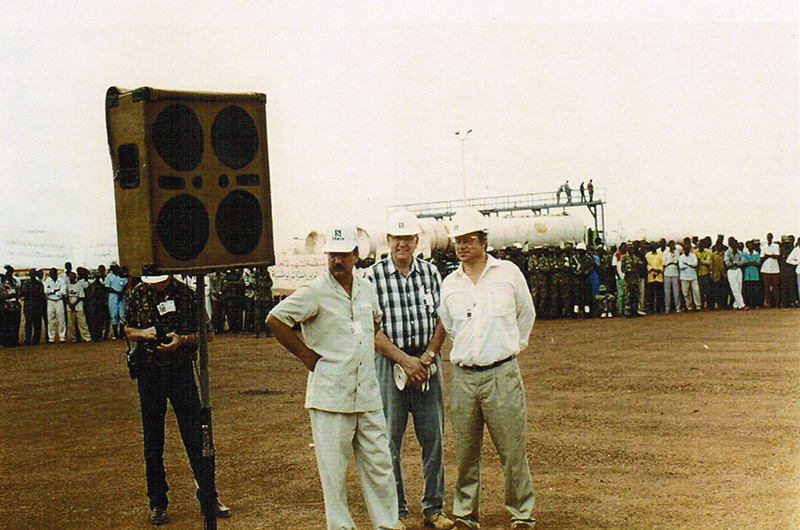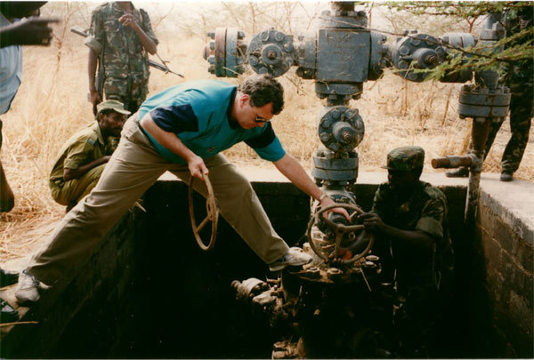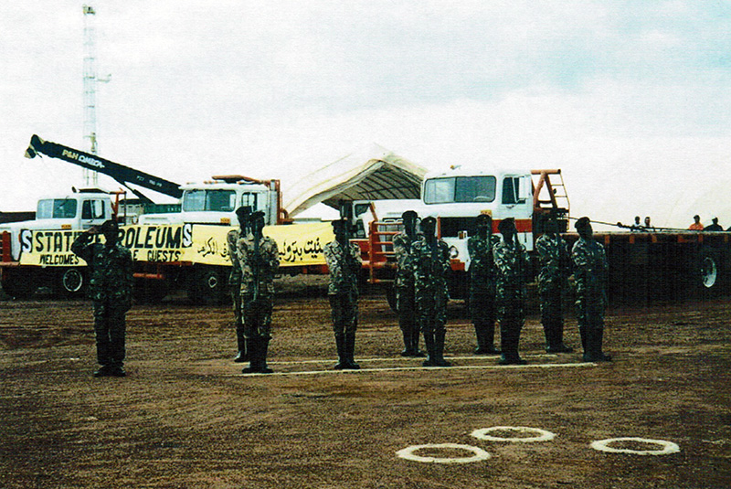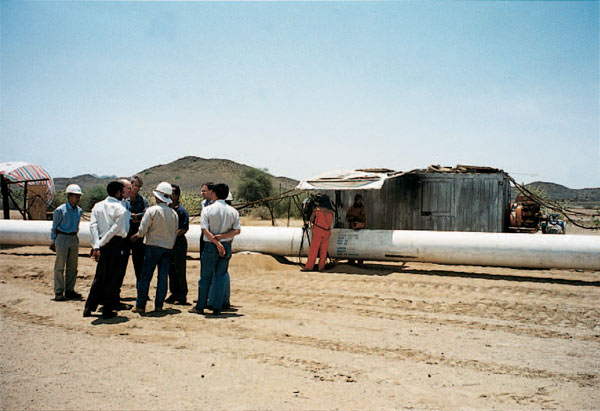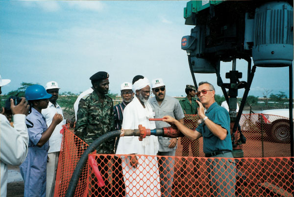 Field Manager briefing Dr. Turabi (the speaker of the Parliament of Sudan) at the opening ceremony the first completed oil well.