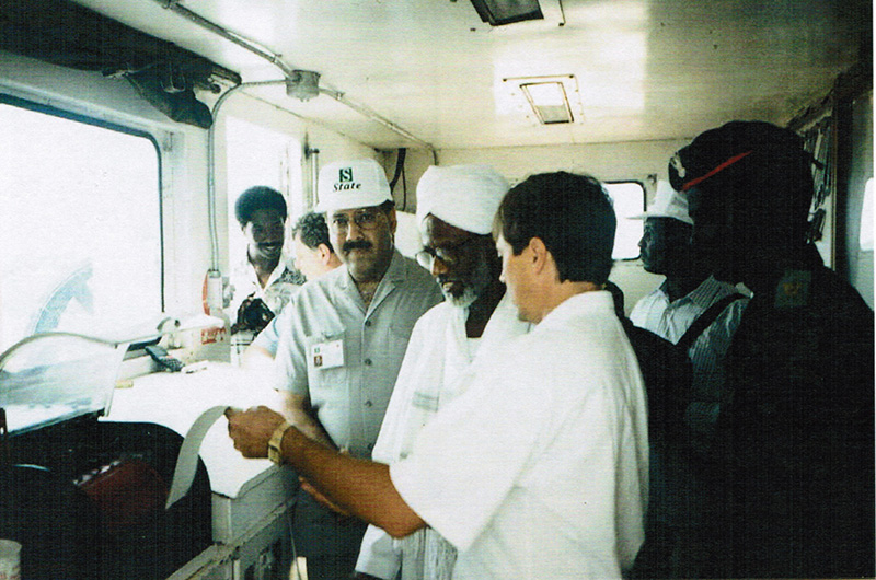 Dr. Turabi, getting briefed on the drilling at the control deck of a drilling rig in Heglig Oilfield.