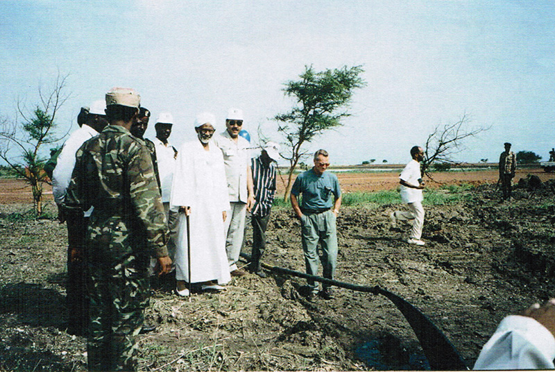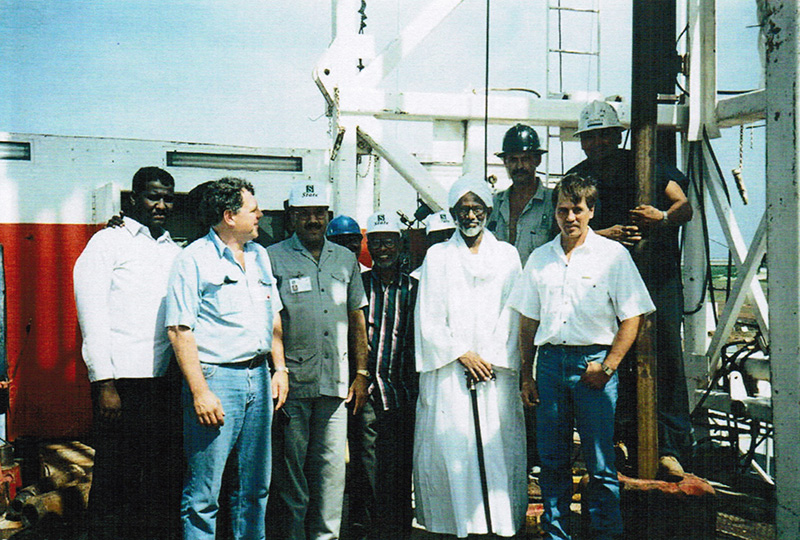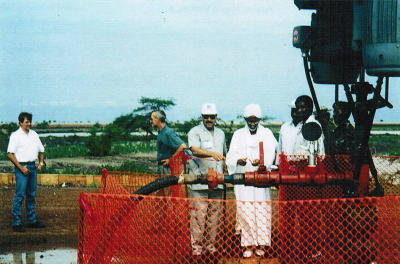 Dr. Turabi with Lutfur Rahman Khan and other leaders viewing the flow of oil in a well drilled in Sudan.