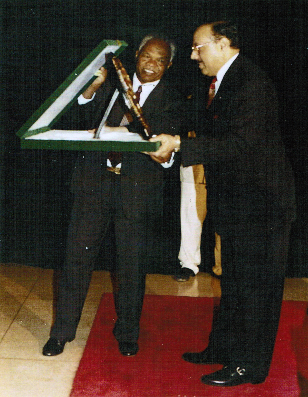 Dr. Awad Ahmed Al-Jaz, Minister of Energy & Mines (Sudan), giving an award to Lutfur Rahman Khan, Chairman of Arakis & State Petroleum for forming a successful International Consortium for the Sudan Project.